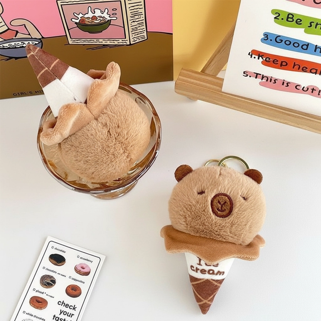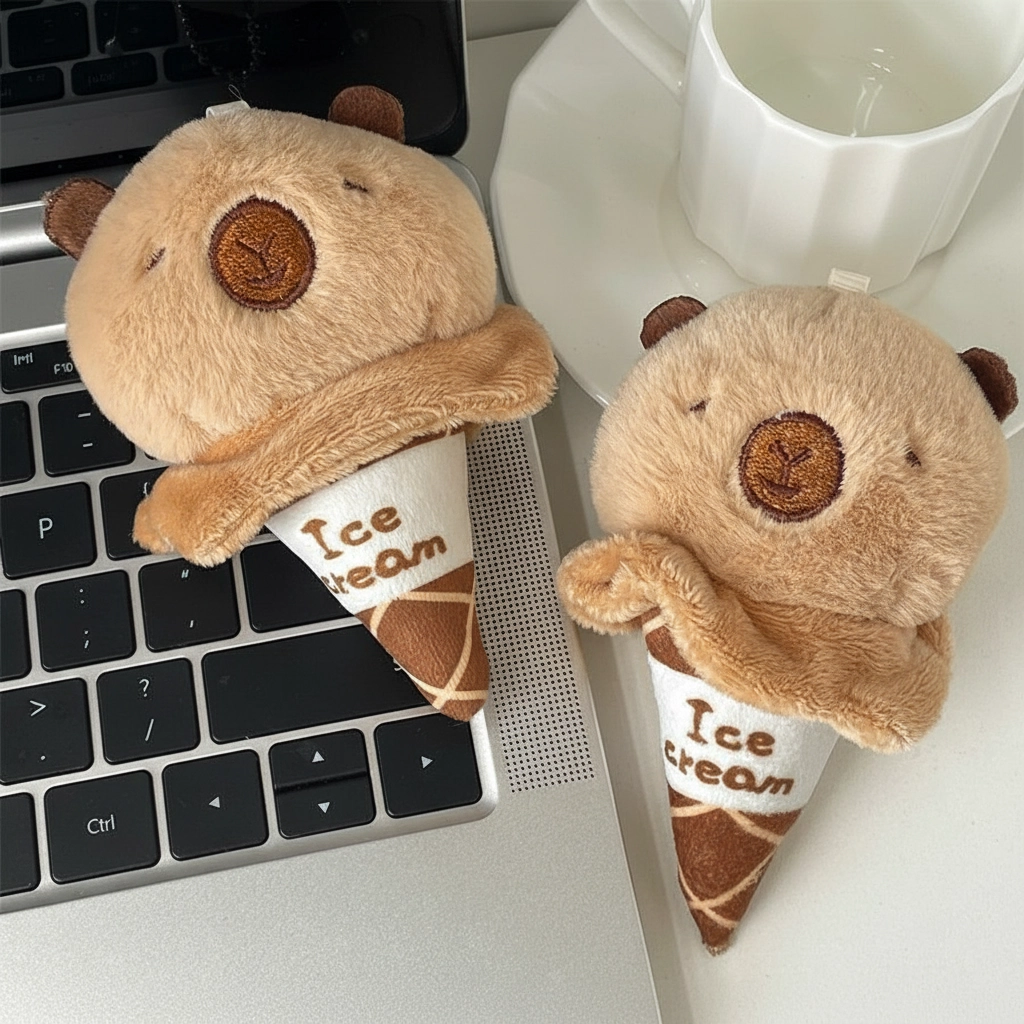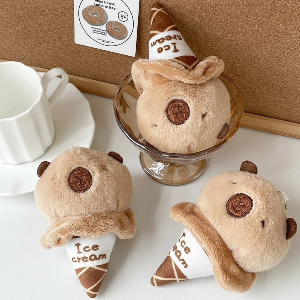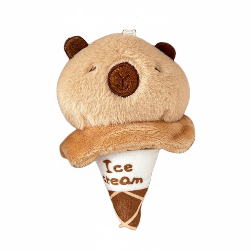 A Sweet Treat for Your Bag Add a touch of sweetness to your daily carry with the Capybara Ice Cream Cone Plush. This creative design merges the relaxed vibe of a capybara with the fun of a summer dessert. It serves as a lighthearted accessory for backpacks, totes, or car keys, offering a unique look for fans of food-themed plushies.