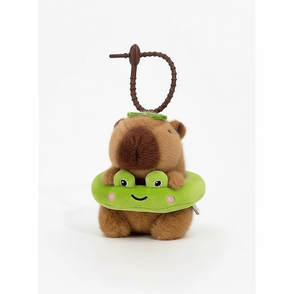 Capybara plushie featuring a green frog swim ring with eyes, hanging from a metal clasp.