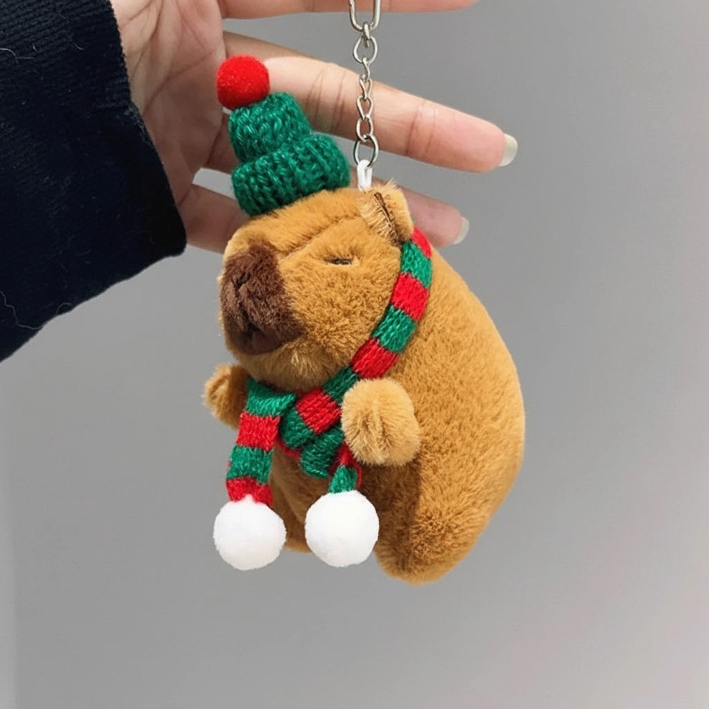 A Cozy Holiday Companion Bring the warmth of the holiday season to your daily routine with this festive Capybara Plush Keychain. Bundled up for winter, this adorable stuffed animal captures the joy of Christmas. Unlike standard plushies, this limited seasonal edition features real knitted accessories, adding a handcrafted, textured feel that contrasts beautifully with the soft fur body.