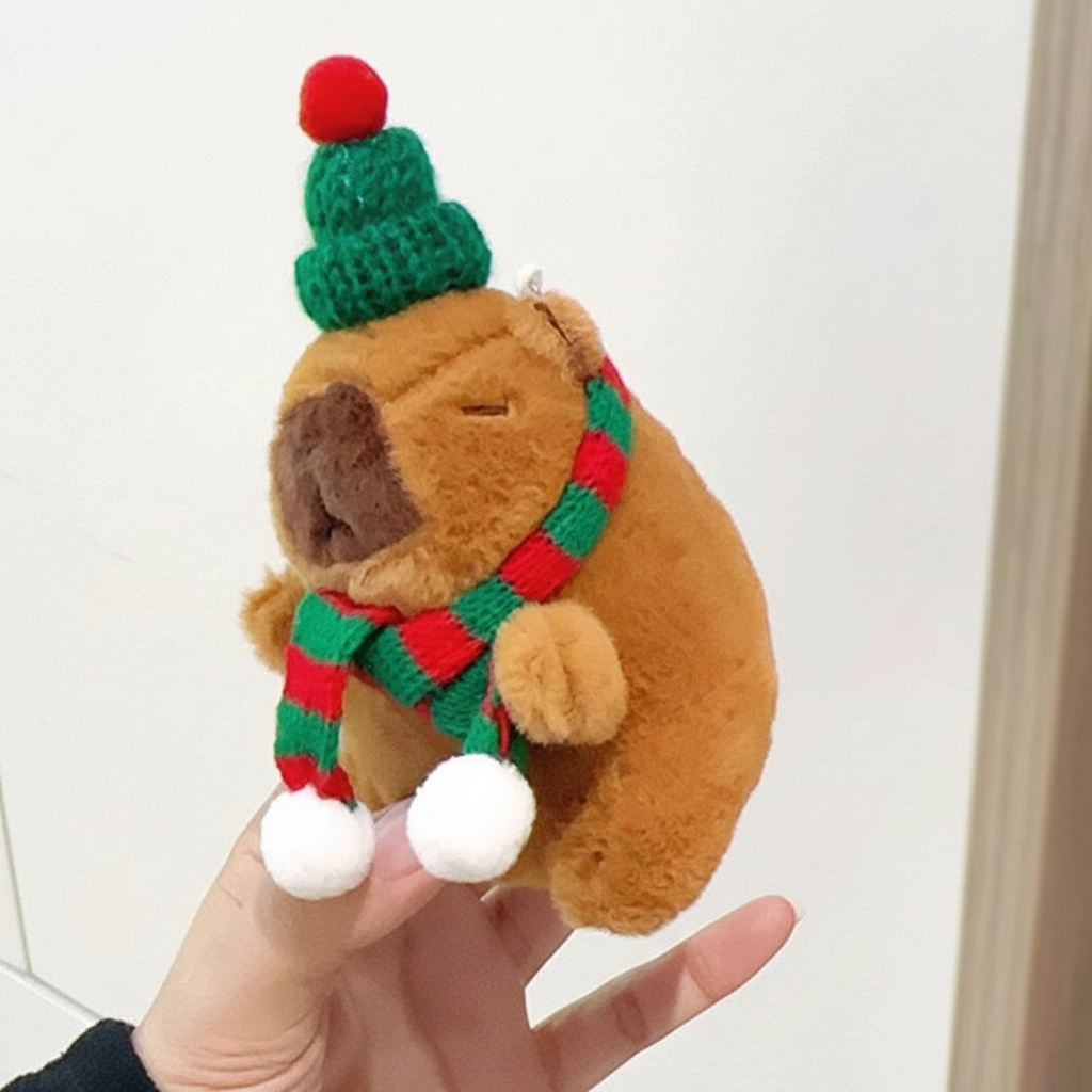 Christmas Edition Capybara Plush Keychain – Winter Holiday Stuffed Animal with Knitted Hat & Scarf