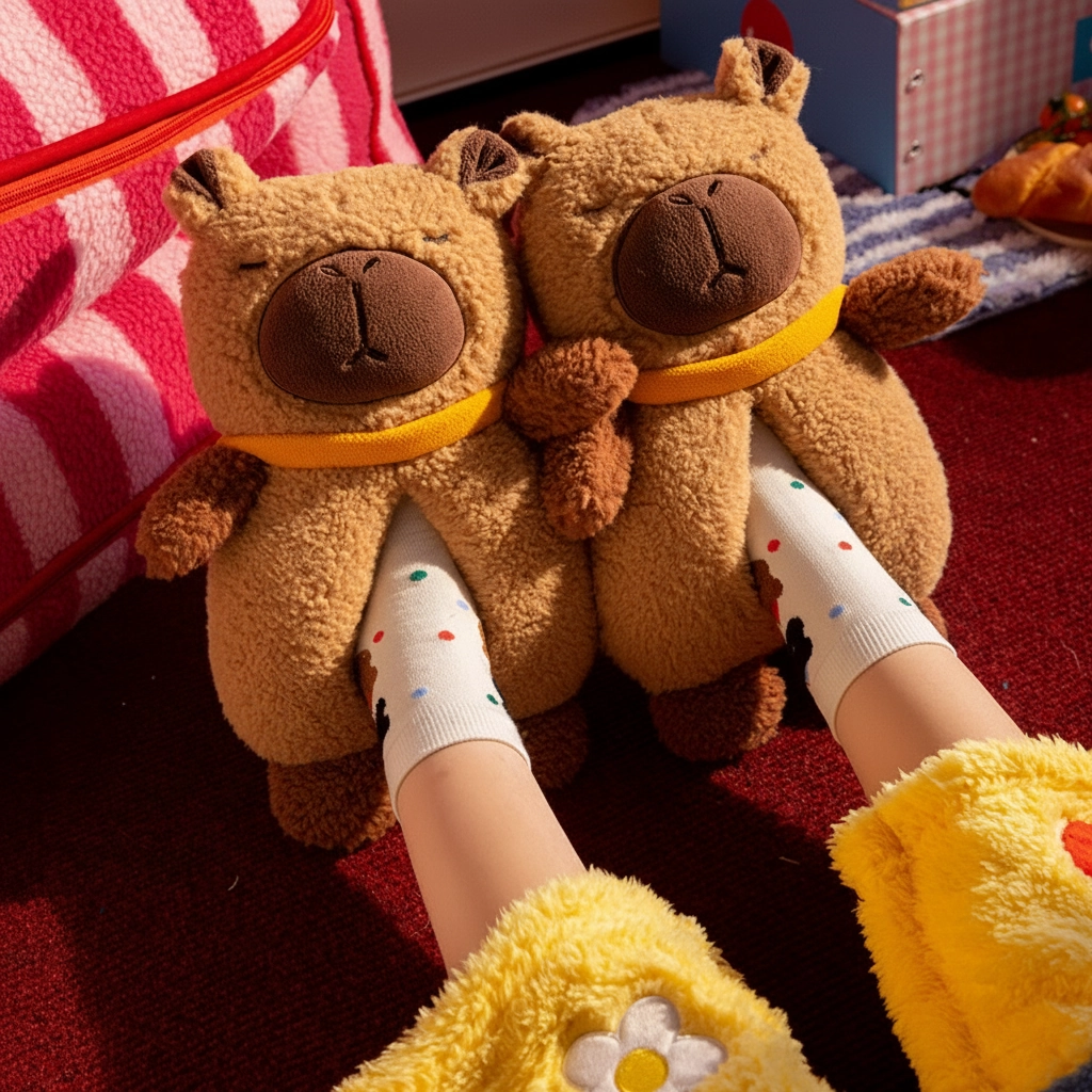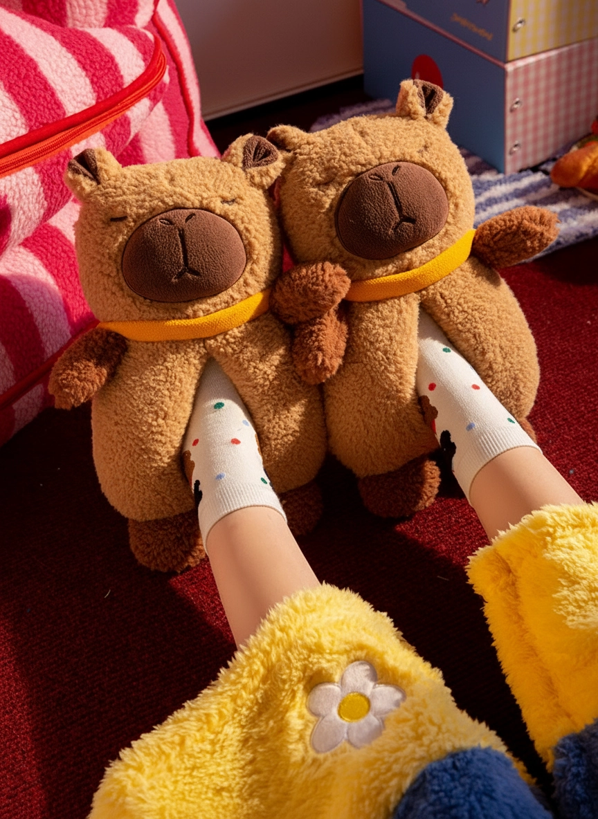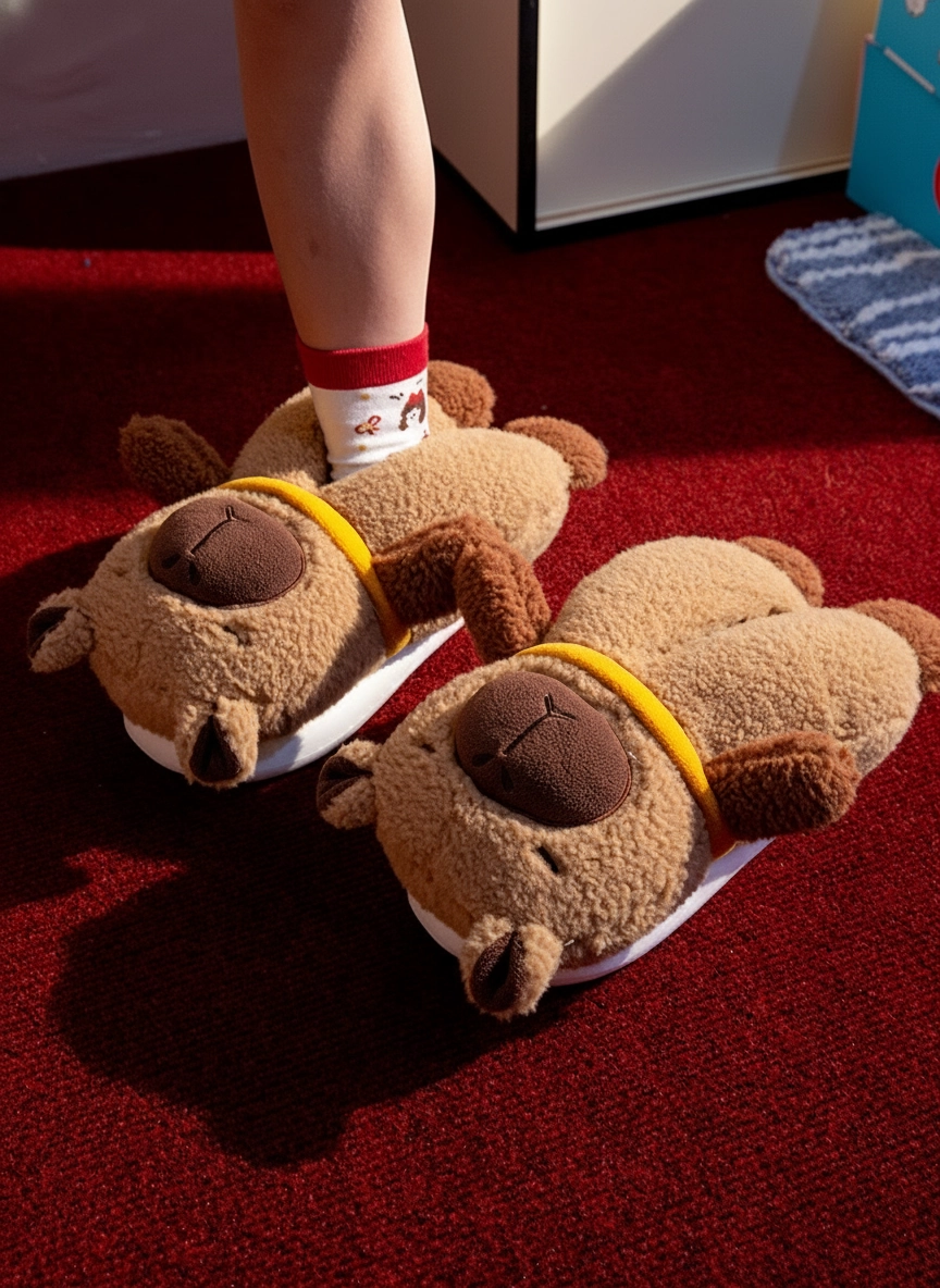 - Signature Yellow Scarf: Each slipper features a cute yellow collar detail, adding a cheerful accent to the classic brown capybara tones.