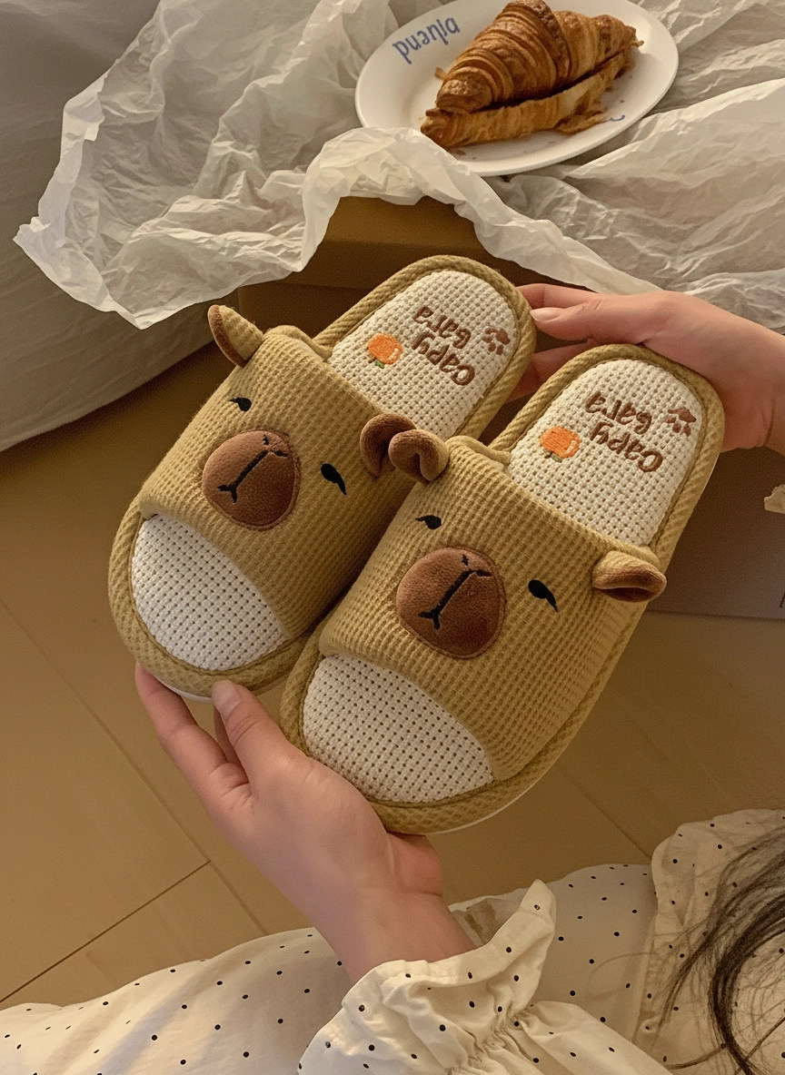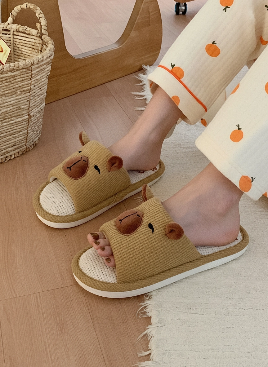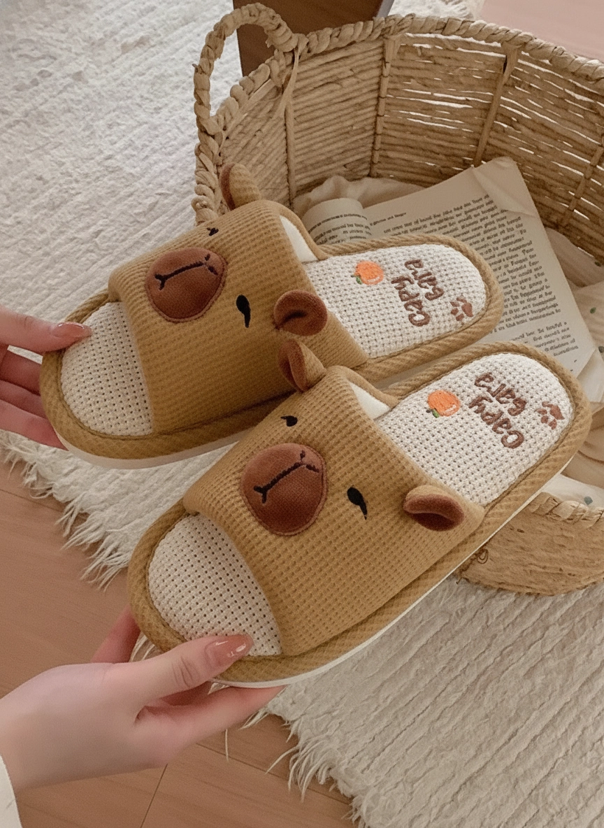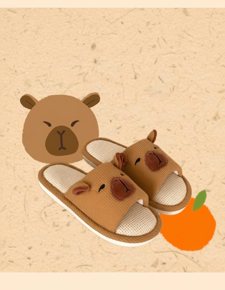 Capybara Linen Slides – Waffle Knit Slippers with Orange Detail
