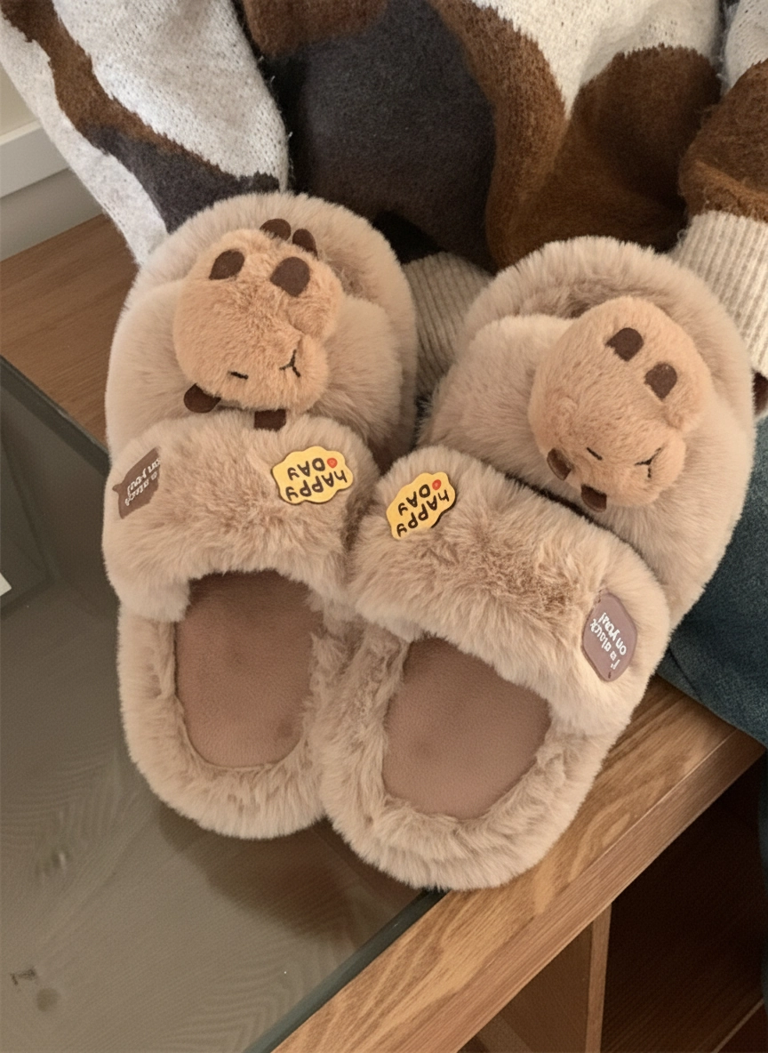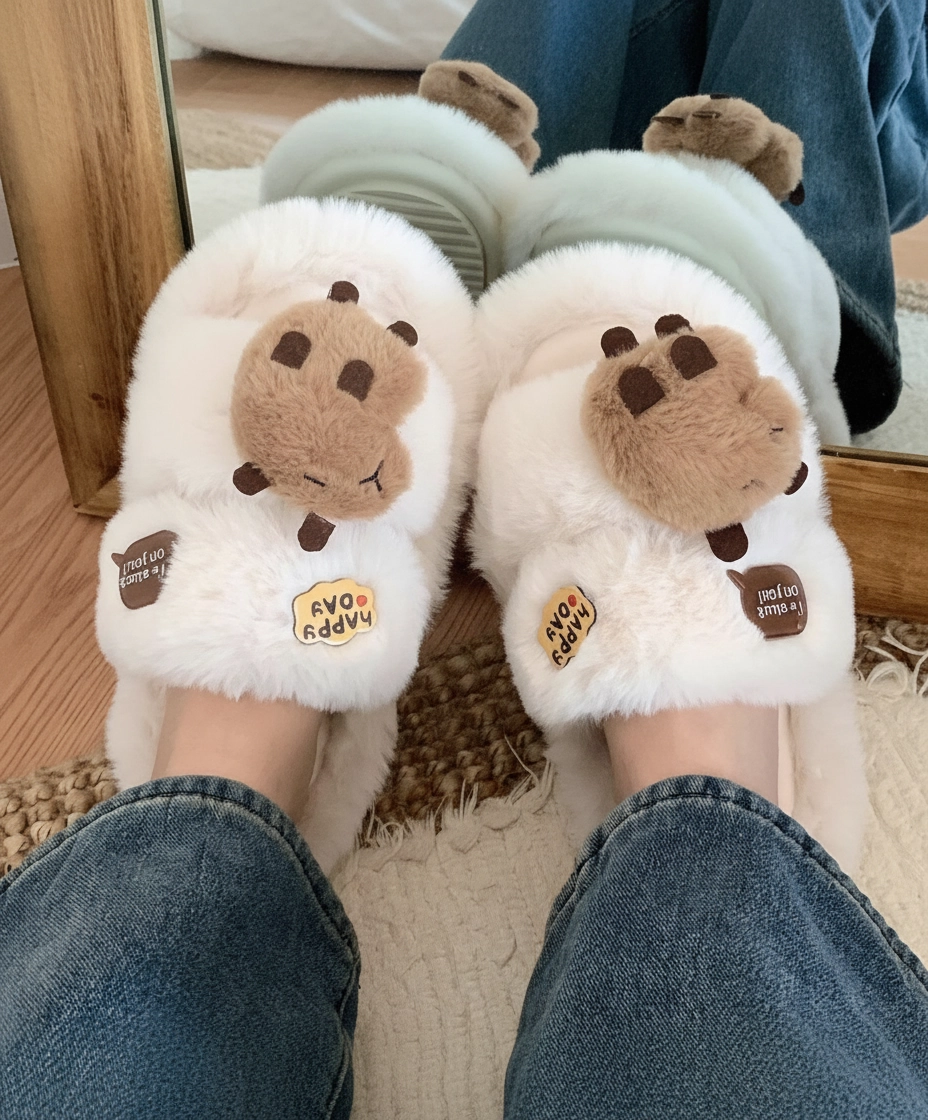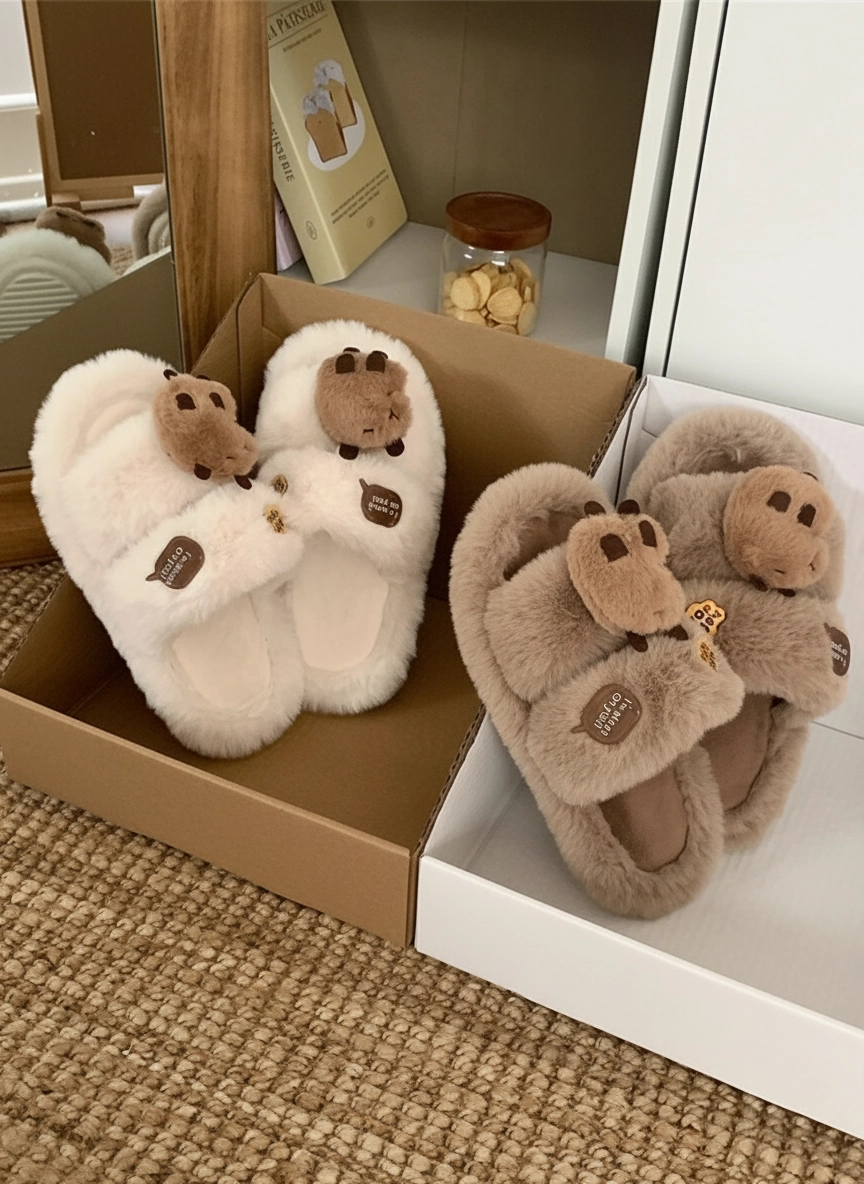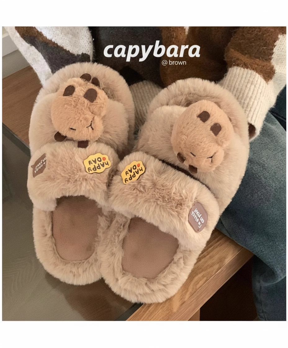 Fluffy Capybara Head Slides – “Happy Day” Plush Slippers (2 Colors)