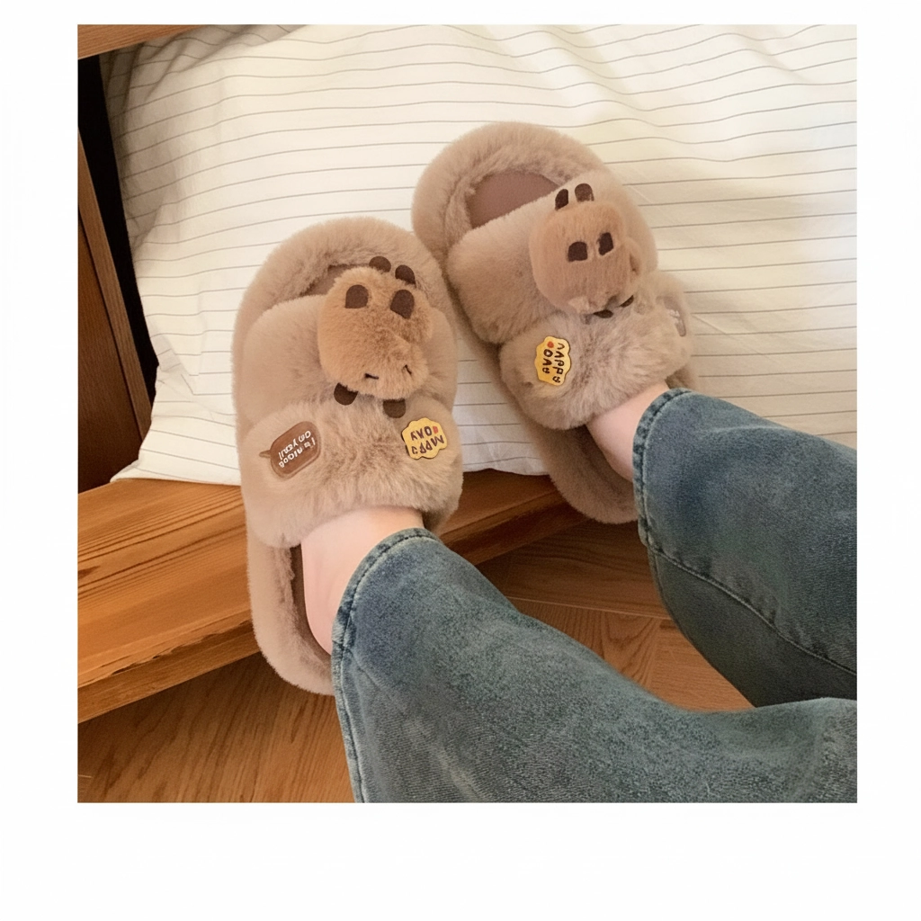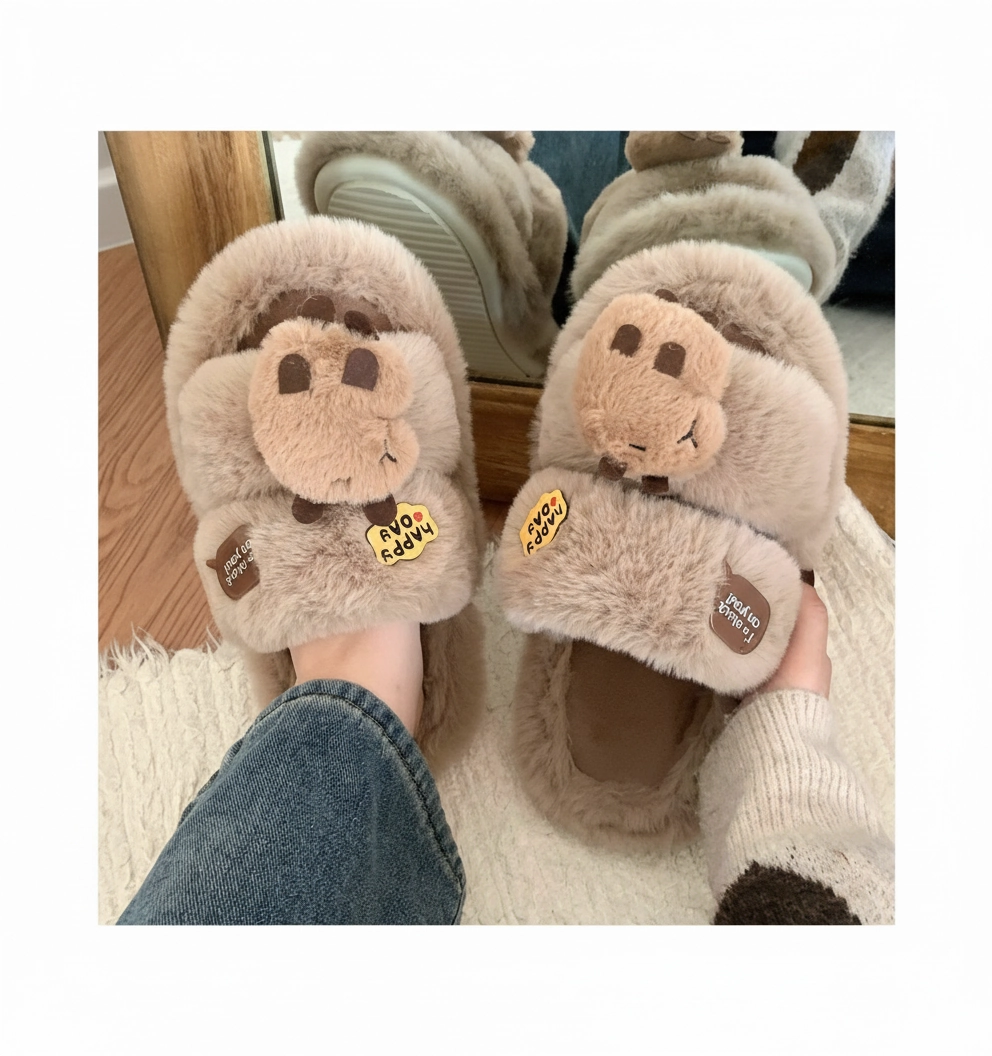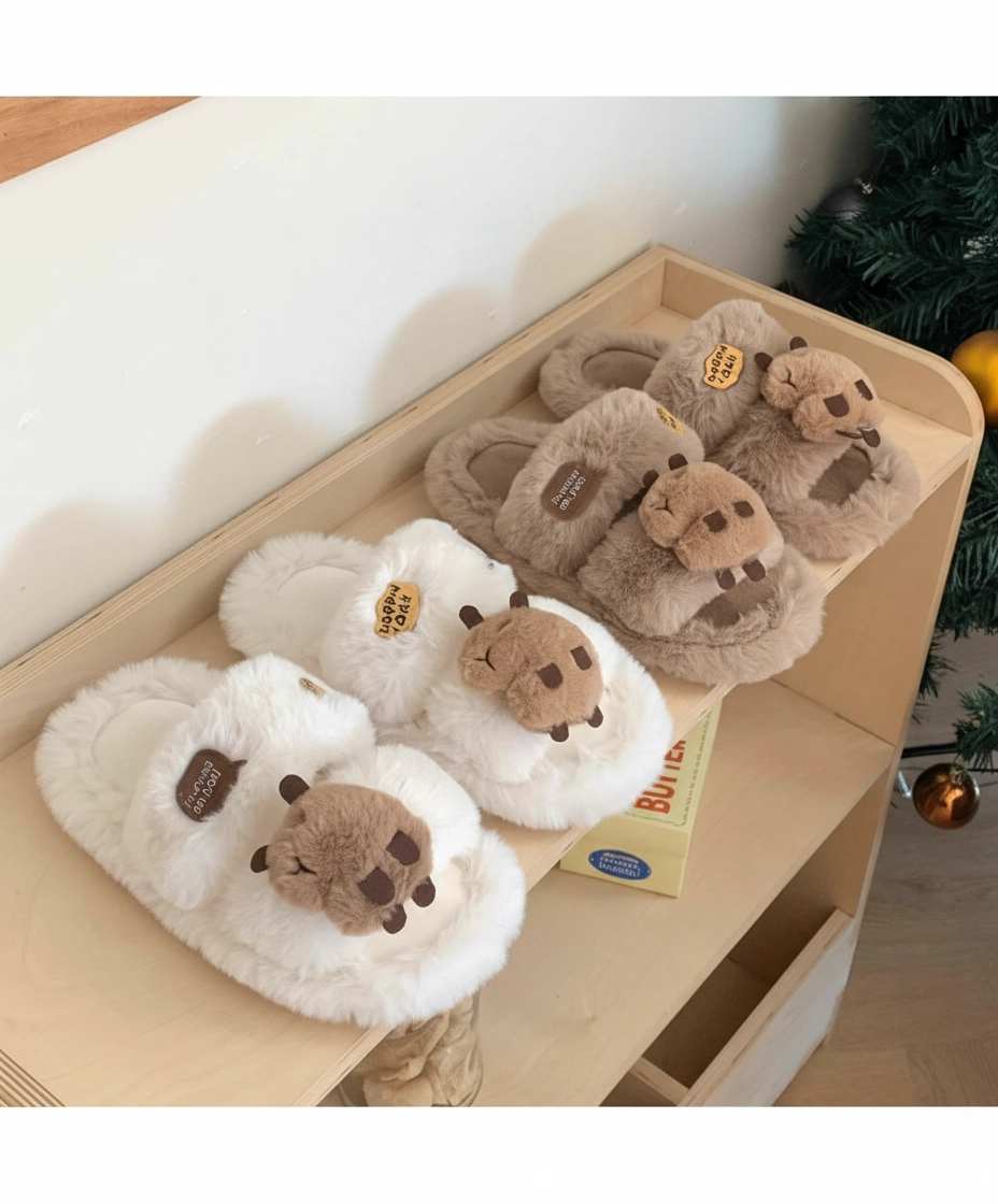 Fluffy Capybara Head Slides – “Happy Day” Plush Slippers (2 Colors)