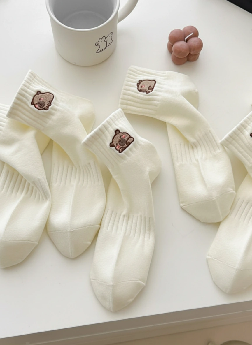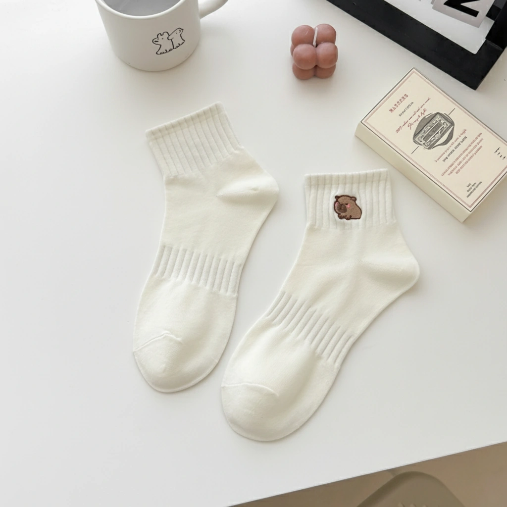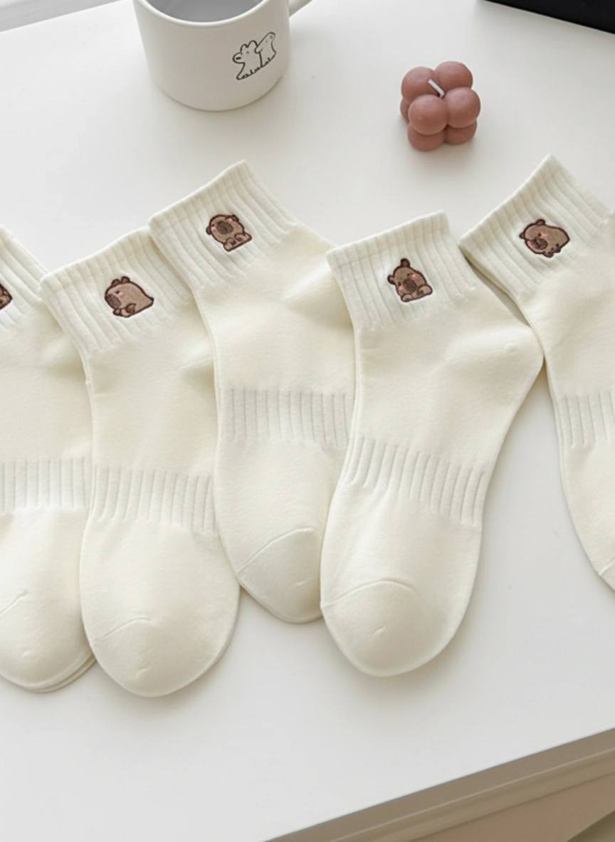 Who says basic white socks have to be boring? Add a subtle touch of personality to your daily outfit with this 5-Pair Set of Capybara White Socks. Designed for those who appreciate a minimalist look but still want to carry the “chill” capybara spirit with them everywhere.