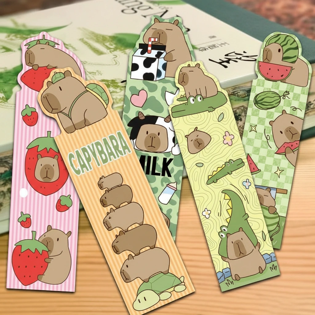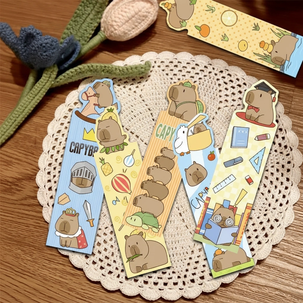 - Shaped “Die-Cut” Tops: Unlike standard rectangular markers, the top of each bookmark is cut to the shape of the capybara’s head, so a cute little face peeks out from the top of your closed book.
