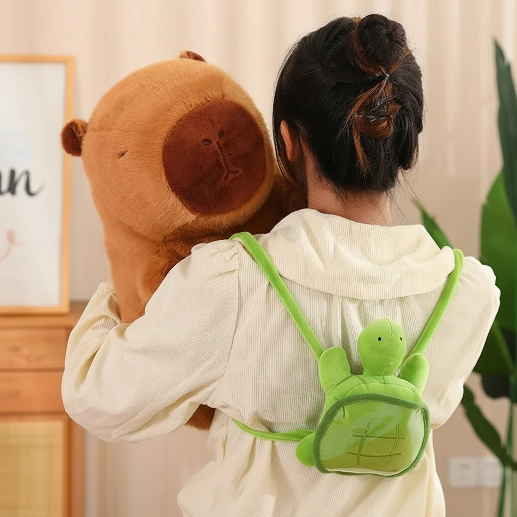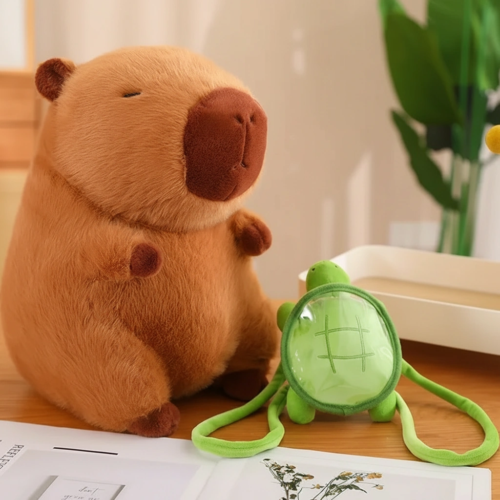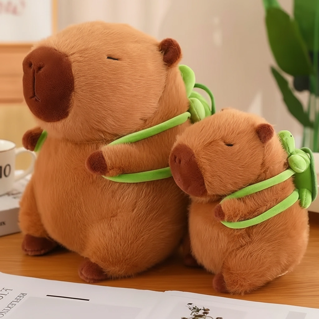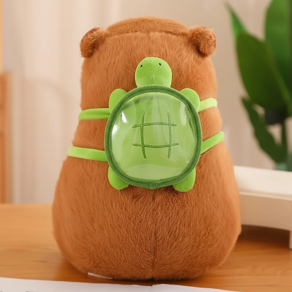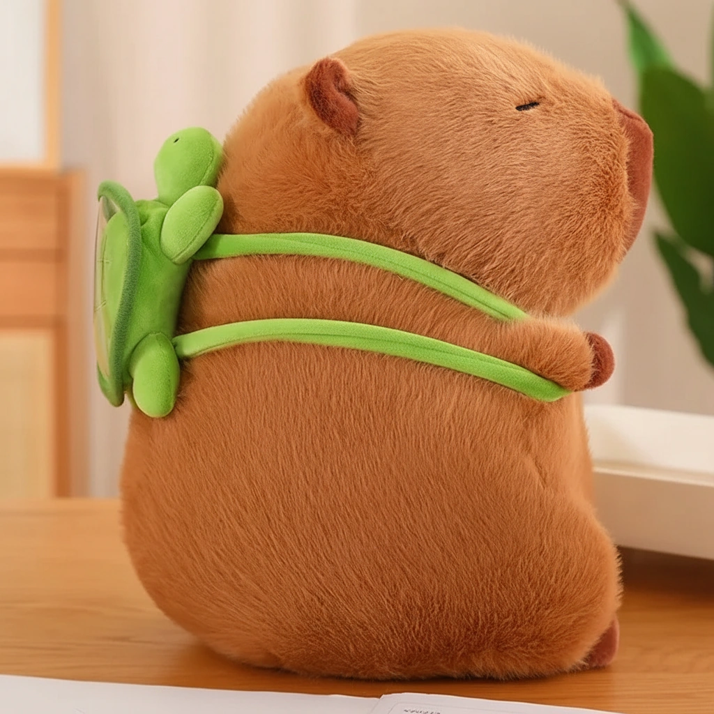 • Adorable Turtle Companion: The star feature is the bright green turtle backpack strapped securely to the capybara, symbolizing their famous real-world friendship.