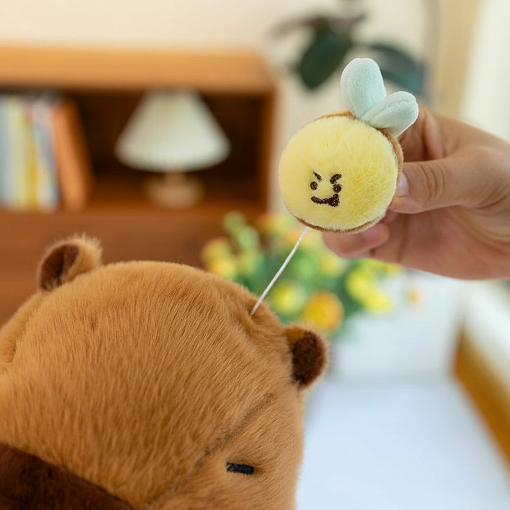 Sitting politely with its eyes closed in pure zen mode, this chubby friend features a unique interactive surprise. Perched on its head is a tiny, grumpy-cute bee. Give the bee a gentle pull, and watch as it automatically and slowly retracts back onto the capybara’s head—like it’s zooming in for a landing!