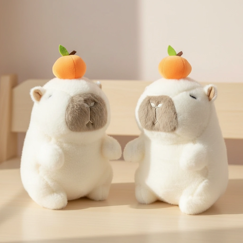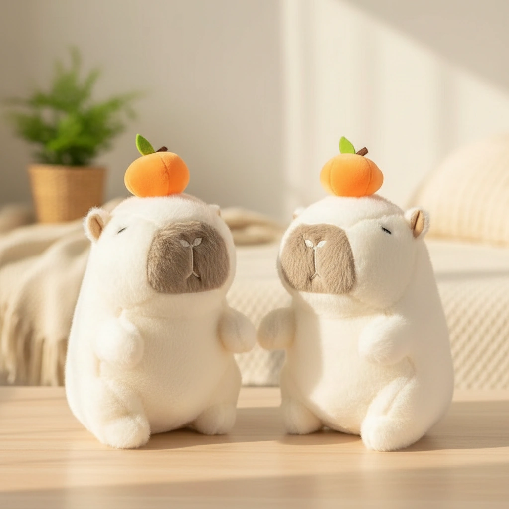 Ready to embrace the “don’t worry, be happy” lifestyle? Meet your new meditation partner. Unlike the standard brown capys you see everywhere, this rare white capybara plush brings a unique, snowy-soft aesthetic to your collection. Sitting peacefully with a bright orange balanced perfectly on its head, this little guy is the definition of unbothered elegance.