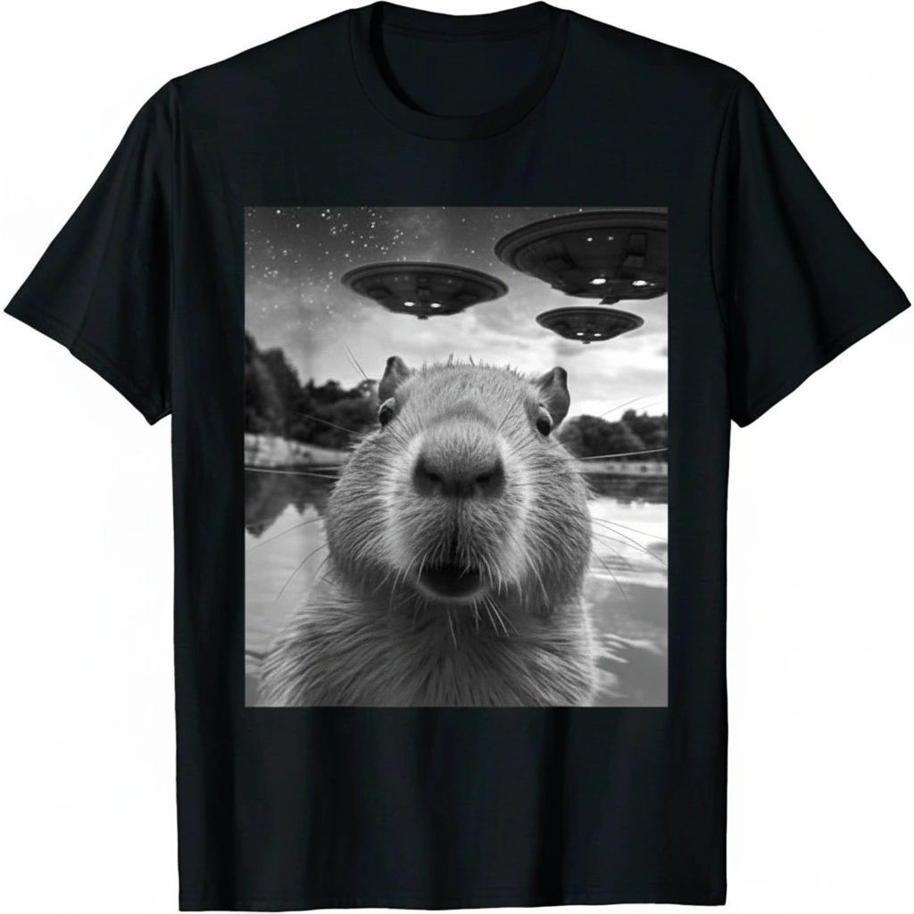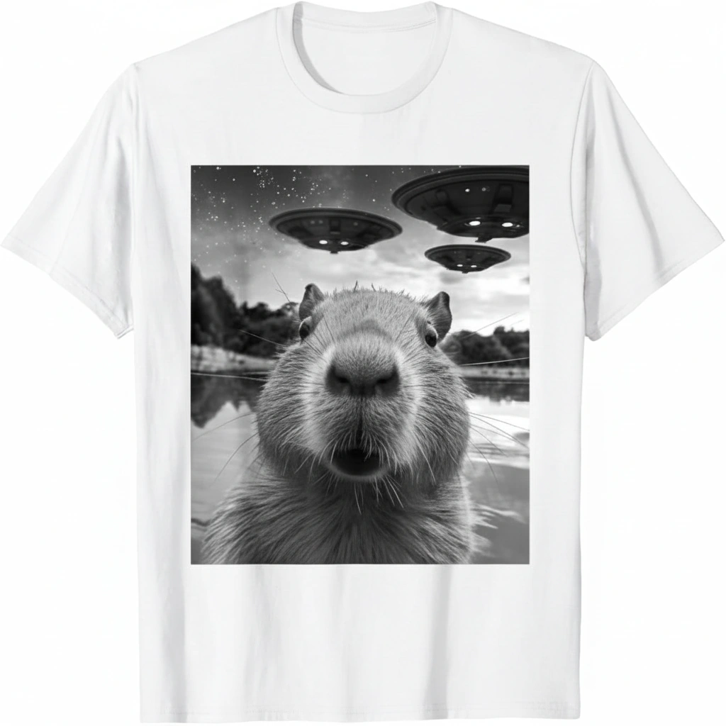 The truth is out there, and apparently, it involves a giant, shocked rodent. This hilarious graphic tee captures the exact moment a capybara witnessed an alien invasion (or maybe just saw a really big vegetable). With vintage-style flying saucers hovering in the background and a close-up of a bewildered capybara face, this shirt is pure sci-fi comedy gold.