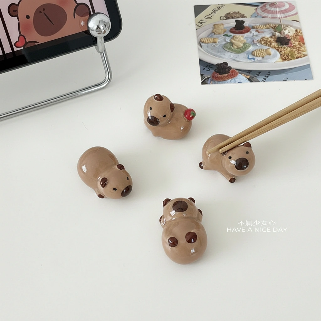 Cute Capybara Ceramic Chopstick Rests – Set of 4 (Glossy Pottery Holders)