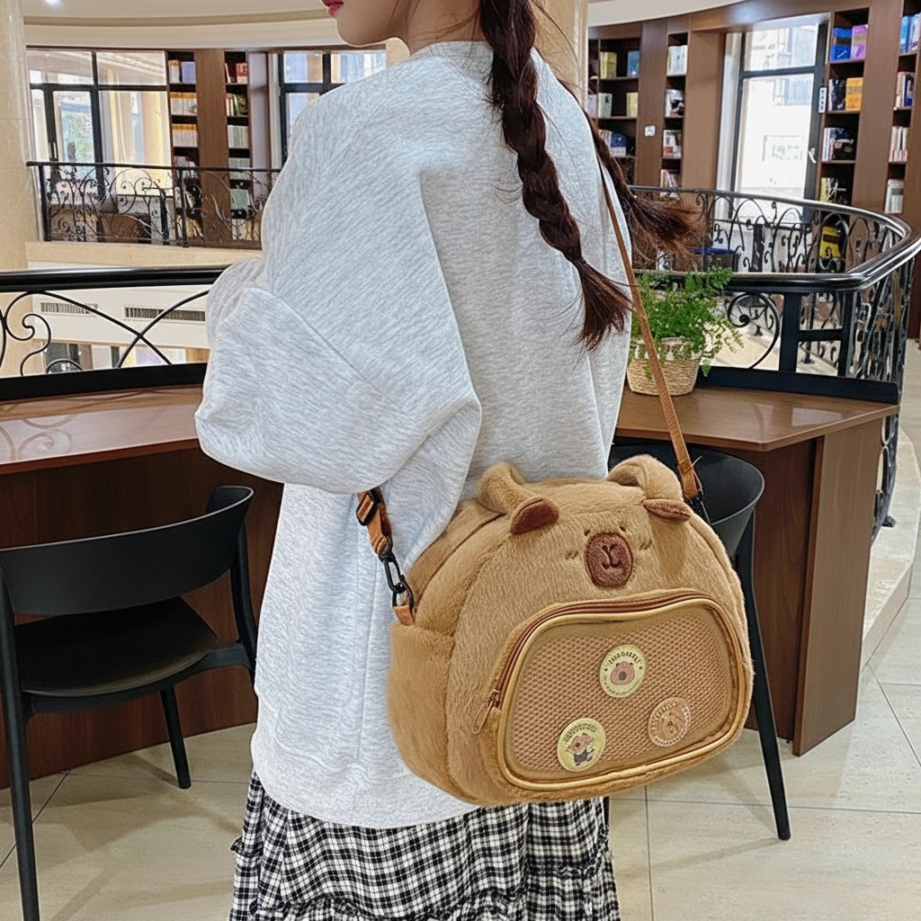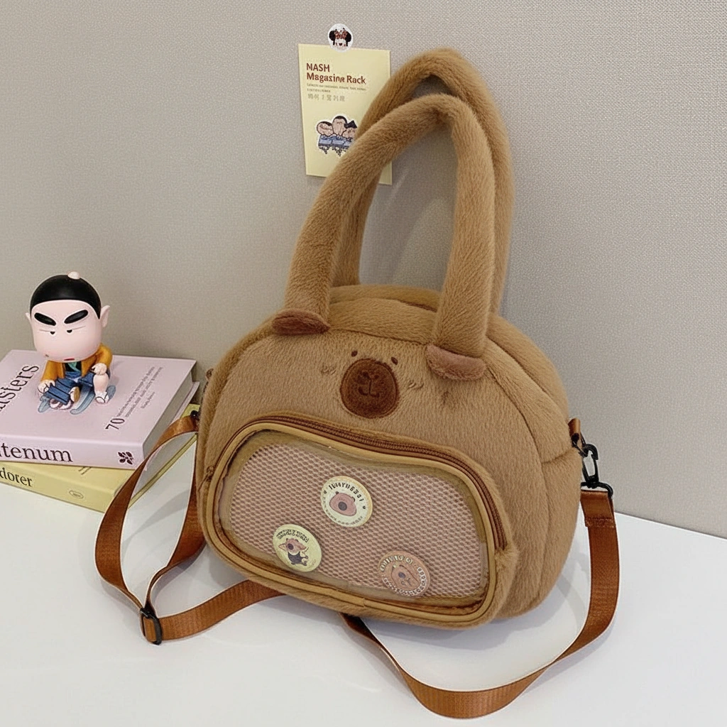 The Coziest Way to Display Your Collection Why settle for a plain bag when you can have a fluffy capybara that showcases your personality? This unique Capybara Plush ITA Bag combines the irresistible softness of a stuffed animal with the functionality of a display tote. The front features a transparent “window” pocket, creating a safe stage for your favorite enamel pins, badges, or anime merch without damaging the bag itself. It’s the ultimate accessory for conventions, meetups, or just adding a creative touch to your daily look.