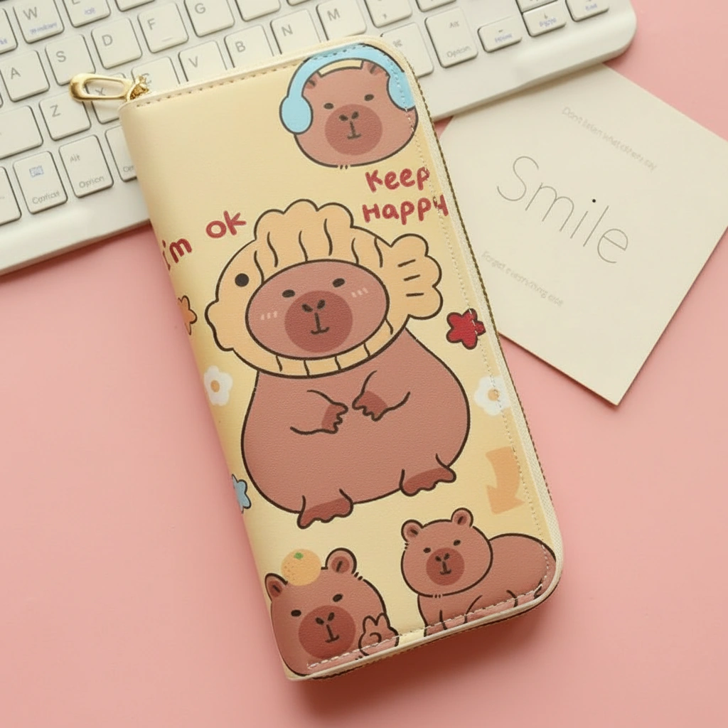 Capybara Creamy Yellow Long Wallet – Zip-Around Clutch with Positive Quotes (6 Styles)